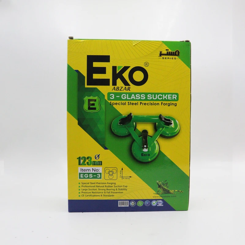 قاپک شیشه اکو مدل سه قلو - قابل استفاده در حمل آسانتر شیشه با سطح صاف - جنس بدنه فلزی مقاوم و مستحکم - دارای ساختار مکش از آلیاژ پلاستیک فشرده و ساخته شده از بهترین مواد اولیه با ضخامت بالا می باشد - دارای طراحی منحصر به فرد و فوم مکش قابل تنظیم است که باعث افزایش چسبندگی شئ برداشته شده می شود - این قاپک (شیشه گیر) مناسب تمامی سطوح صاف شیشه می باشد. - طول هر ( قطر قاپک ) ۱۲۳ میلی متر - مخصوص انواع شیشه، سنگ و ورق ام دی اف - تحمل وزن تا ۱۰۰کیلو گرم